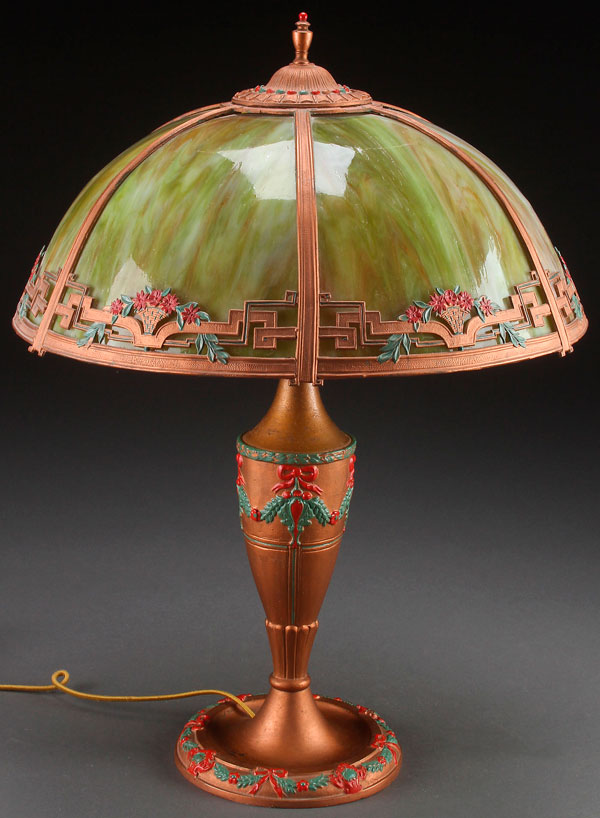 A POLYCHROME METAL AND SLAG GLASS TABLE LAMP, EARLY 20TH CENTURY. With six bent panel shade. Height 24 inches (61 cm).