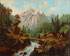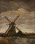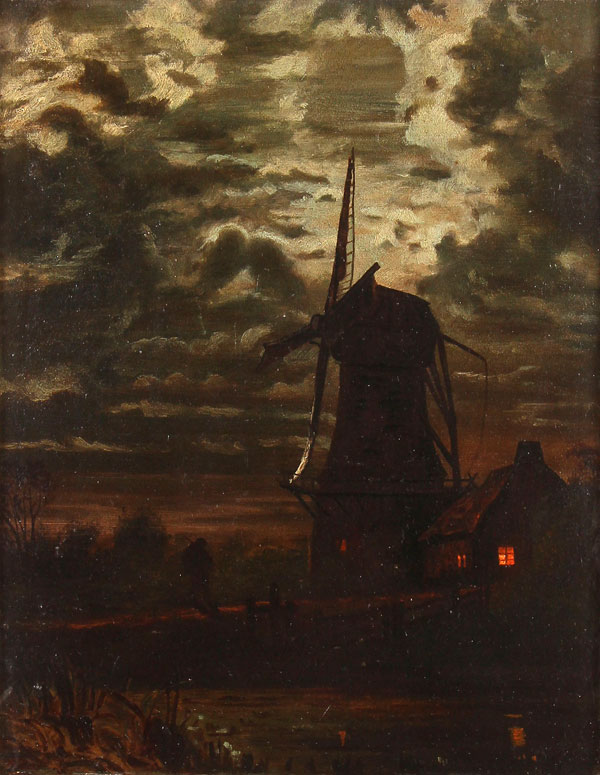 A PAIR OF DUTCH WINDMILL LANDSCAPE PAINTINGS, 19TH CENTURY. One oil on canvas measuring 16.5 inches x 13.75 inches and signed lower right Marisk?; together with a similar scene, oil on artist board, unsigned, 14.25 inches x 11.25 inches; also a large Alpine Mountain Scene with Chalet, figure and cattle, oil on canvas, unsigned, 20 inches x 25 inches.