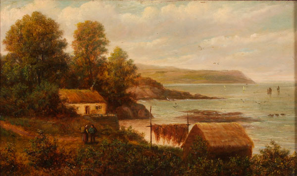 A PAIR OF BRITISH LANDSCAPE PAINTINGS, 19TH CENTURY. Comprising an oil on wood panel Oceanside Scene with Fisherman and Wife inscribed on verso Garwick, 11.75 inches x 20 inches. Together with an oil on artist board painting of Kilchurn Castle, oil on canvas laid down on board, measuring 11 inches x 15.25 inches.