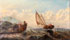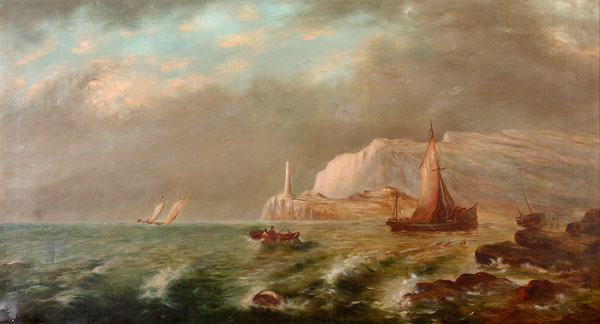 A GROUP OF SIX VICTORIAN PARLOR PAINTINGS, CIRCA 1870-1915. Comprising a large Seascape with Lighthouse, Boats and Fisherman, oil on canvas, apparently unsigned, 22 inches x 40 inches; another Seascape with Fishing Boat and Shoreline Onlookers, oil on canvas, apparently unsigned, 20.5 inches x 35.5 inches; a Dutch Cityscape with Canals, oil on canvas, indistinguishably signed lower left and dated 1897, measuring 22 inches x 28 inches; a Capriccio with Distant Castle on Lake, oil on canvas, apparently unsigned, 19 inches x 25.25 inches; an expansive Western Mountainous Landscape with Grazing Cattle, Hay Makers and Distant Town, unsigned, 20 inches x 27 inches; and a Nocturnal Lake Scene, oil on canvas, indistinguishably signed on stretcher, 18 inches x 36 inches.