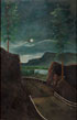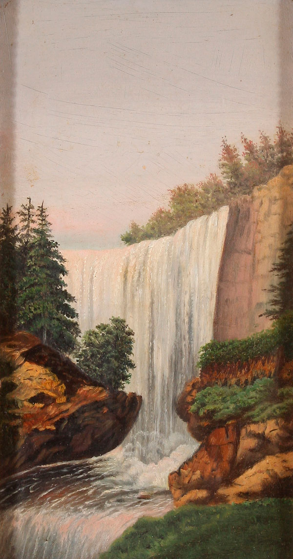 A GROUP OF FIVE OIL PAINTINGS, CIRCA 1875-1915. Comprising a Summer Landscape with Small Waterfall, oil on board, signed lower right "Whiraly"?, 10.25 inches x 7.25 inches; an Expansive Western Mountainous Landscape at Dusk, oil on canvas board, signed lower left H. A. Mills, 9.5 inches x 14 inches; a Large Raging Waterfall, oil on artist board, unsigned, 12.25 inches x 6.75 inches, contained in an attractive vintage gilt pressed daisy frame; a Nocturnal Roadside Scene, oil on artist board, unsigned, 14 inches x 9.25 inches; and an attractive European Nocturnal Dockside Cityscape, oil on canvas board, unsigned, 5.75 inches x 8.25 inches.