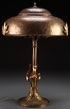 AN ARTS AND CRAFTS BRASS TABLE LAMP, CIRCA 1900. Probably Austrian, with stylized foliate form base supporting a brass mushroom shape shade. Overall height 23.5 inches (59.5 cm).
