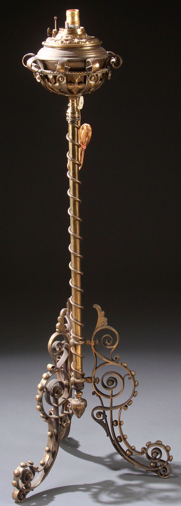 A VICTORIAN GILT BRONZE ORGAN LAMP, LATE 19TH CENTURY. Adjustable height, missing burner. Height 49 inches (124.5 cm).