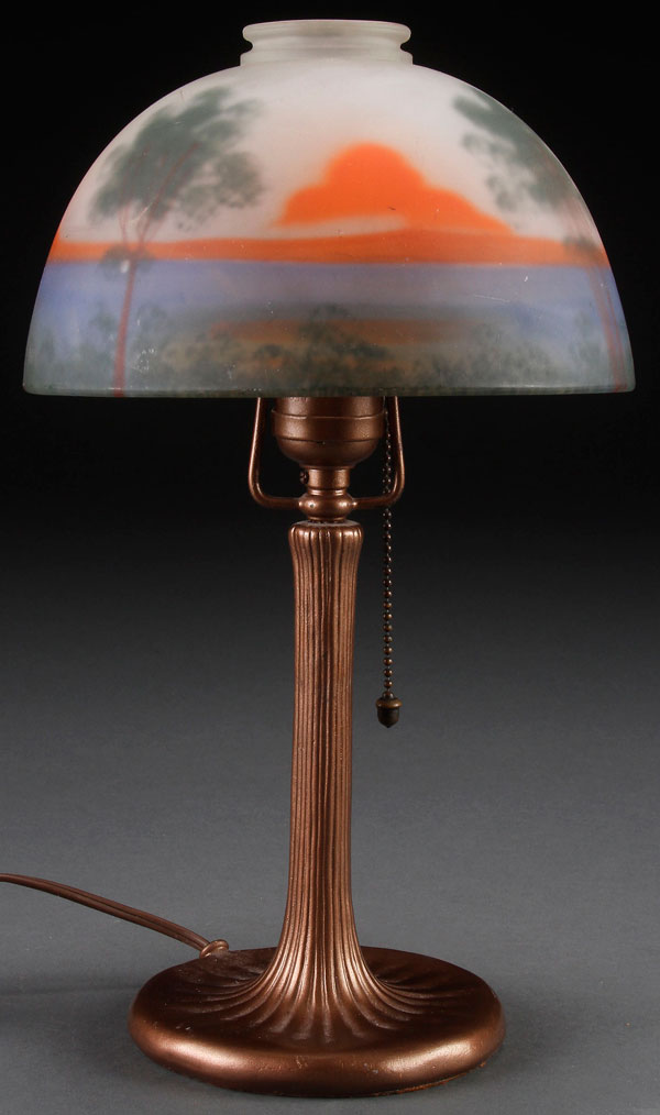 A HANDEL BOUDOIR LAMP, EARLY 20TH CENTURY. The metal base embossed Handel, and with cloth Handel tag. Supporting a reverse painted glass shade, heat cap and shade rest absent. Height 13.75 inches (35 cm).