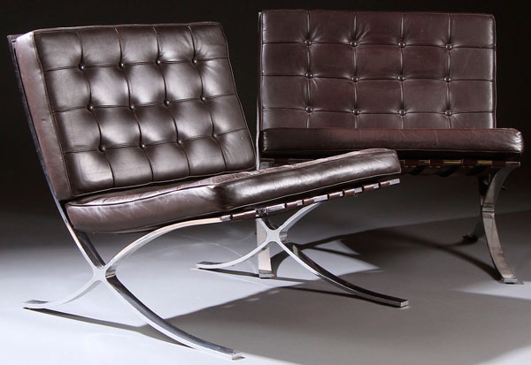A PAIR OF BARCELONA STYLE LOUNGE CHAIRS, LATE 20TH CENTURY. Leather upholstered loose cushions on X form chrome iron frames. Height 29.5 inches (75 cm), width 30 inches (76 cm), depth 30 inches (76 cm).