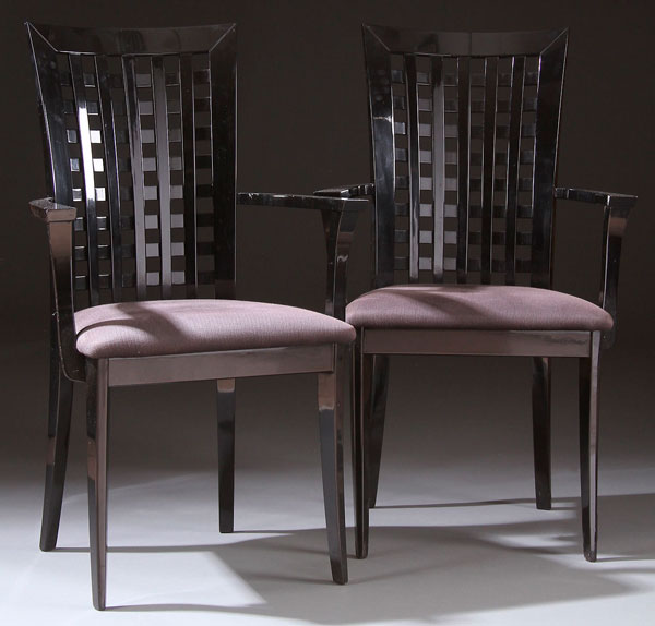 A PAIR OF CONSTANTINI PIETRO BLACK LAQUERED ITALIAN ARM CHAIRS, LATE 20TH CENTURY. With open lattice backs. Height 39 inches (99 cm), width 24.5 inches (62 cm), depth 23 inches (58.5 cm).
