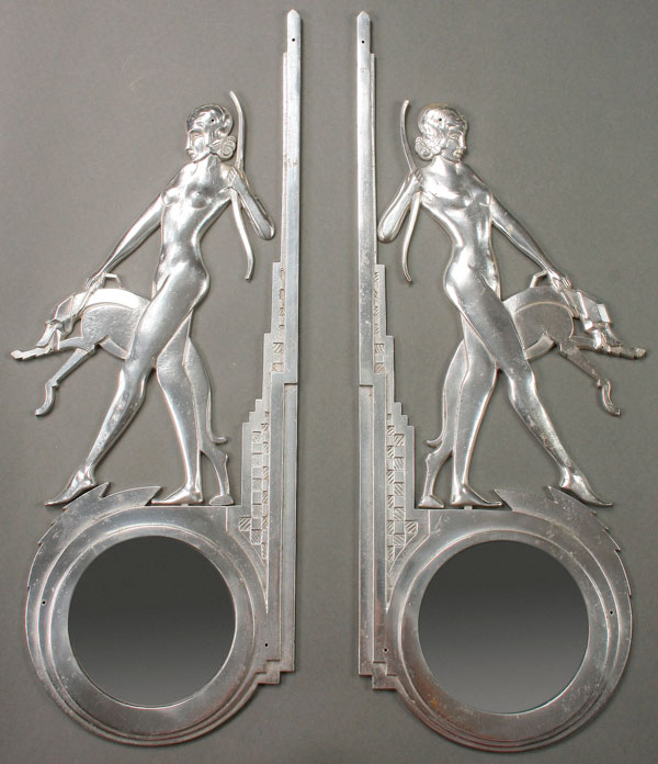 A PAIR OF CAST ALLUMINUM MIRRORED WALL BRACKETS, 20TH CENTURY. Each depicting nude archers with dogs, standing above a convex circular mirror. Height 26 inches (66 cm).