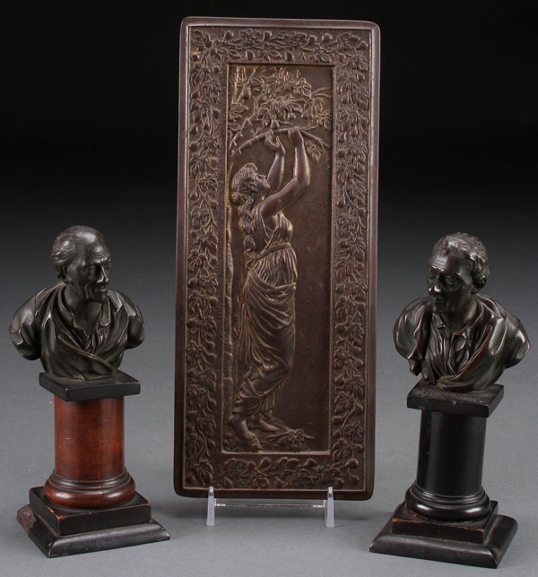 A 19TH CENTURY DECORATIVE BRONZE GROUP. Comprising two bronze busts of philosophers, raised on turned wood pedestals, height 6.5 inches (16.5 cm); and a Neo-Classic relief plaque of a woman harvesting fruit, 10.25 inches (26 cm).