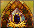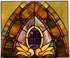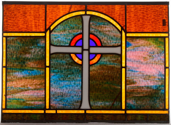 A GROUP OF THREE STAINGLASS AND LEADED WINDOW PANELS, EARLY 20TH CENTURY. All designed with crosses in center, all unframed. 19.5 x 23.5 inches (50 x 60 cm) and 18 inches x 25 inches (46 x 64 cm).