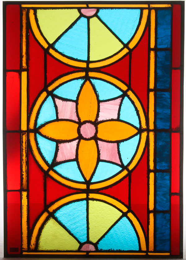 A GROUP OF THREE STAINGLASS AND LEADED WINDOW PANELS, EARLY 20TH CENTURY. Consisting of a matching pair, 19 inches x 28 inches (48.25 x 71 cm), and a rectangle design with various shades of green glass, 19.5 inches x 31.5 inches (50 x 80 cm), all unframed.
