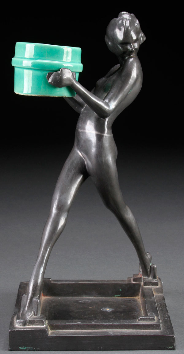 A FRANKART FIGURAL NUDE ASH TRAY PLANTER, CIRCA 1920S. Of a woman holding a pottery posy vase. Ash tray absent. Embossed Frankart Inc. Pat. Appld. Height 12.75 inches (32.5 cm).