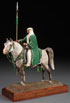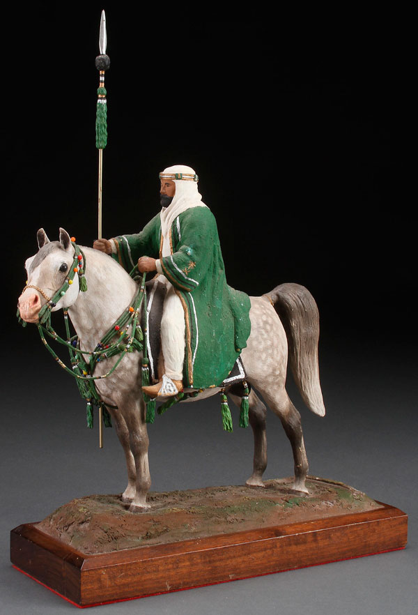 A HAND SCULPTED ARAB HORSE WITH ARAB RIDER, COMPOSITION AND POLYCHROMING, 20TH CENTURY. Signed on base "F. W. Eustis" and "S.A.A" and numbered 24/150. Set in an integral wooden base. Length 12.5 inches, overall height 16.75 inches.
