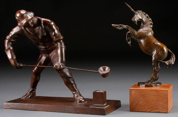 A PAIR OF SCULPTURES , 20TH CENTURY. Comprising a bronzed metal foundry worker, inscribed on base "E.v.d. Dresch D f", height 9.7 inches, width 10.4 inches. Together with a rearing bronze Capricorn by Sterett-Giltings Kelsey (American b. 1914), signed on base Kelsey, dated 1971 and numbered 130/975. Height of bronze 8 inches.