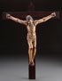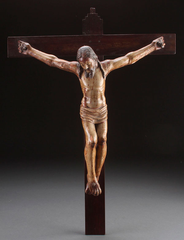 A CRUCIFIX, 18TH CENTURY. A carved and polychromed wood crucified Christ mounted on a wood cross, the figure of Christ carved in full round, of good proportions, exaggerated anatomy and cascading hair. Retaining a good amount of the original polychrome and with losses to fingertips. Overall height including cross 29.25 inches (74.3 cm).