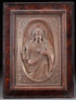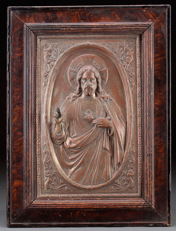 AN INTERESTING SILVERED COPPER REPOUSSE PLAQUE OF THE SACRED HEART OF JESUS, 19TH CENTURY. Set into the original faux burl wood frame. Overall size including frame 21.5 inches x 16 inches.