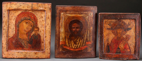 A GROUP OF THREE RUSSIAN ICONS, 18TH/19TH CENTURY. Comprising a Kazan Mother of God, 14.5 inches x 12.5 inches, the Not Made By Hands image, 13.75 inches x 10.5 inches; and St. Paraskeva, 12.25 inches x 10.75 inches.