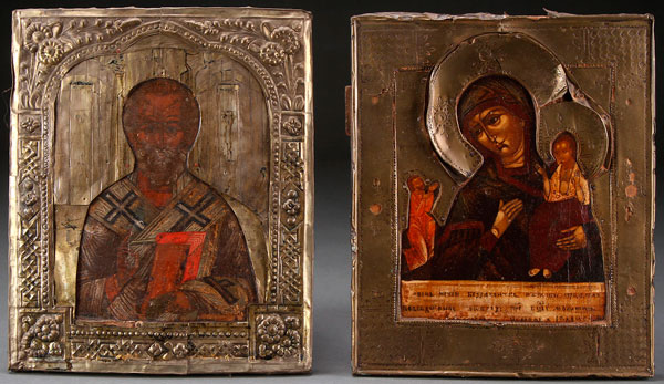 A PAIR OF RUSSIAN ICONS, 19TH CENTURY. St. Nicholas and the Mother of God of Unexpected Joy. Both with decorative metal basma and each measuring about 10 inches x 12 inches (25.4 x 30.5 cm).