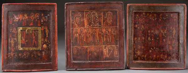 THREE RUSSIAN ICONS, 18TH/19TH CENTURY. Comprising two icons of the resurrection with Descent and Feast Day surround. Together with an icon in seven parts including the Kazan Mother of God, the Descent and St. Nicholas, together with a gathering of other saints. Each approximately 12 inches x 11 inches (30.5 x 28 cm).
