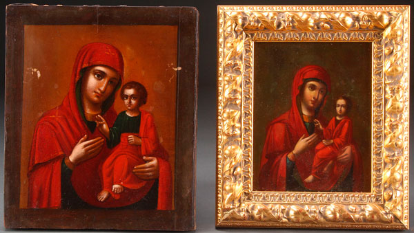 A PAIR OF RUSSIAN ICONS, EACH DEPICTING THE HODEGETRIA MOTHER OF GOD, 19TH CENTURY. In the Western style. 12.25 inches x 10.5 inches (31 x 26.6 cm) and 9 inches x 7 inches (22.8 x 17.8 cm). The second contained in a later gilt frame.