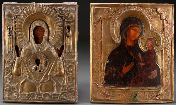 A PAIR OF RUSSIAN ICONS, 19TH CENTURY. Comprising the Sign Mother of God and theTikhvin Mother of God , both overlaid with metal basma and each measuring approximately 12 inches x 9 inches (30.5 x 22.8 cm).