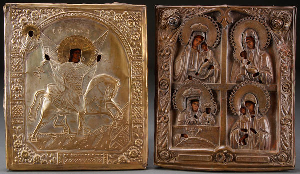 A PAIR OF RUSSIAN ICONS, 19TH CENTURY. Comprising an icon of the Archangel Michael- an Apocalyptic vision, overlaid with a metal riza, 12.25 inches x 10.25 inches (31.1 x 26 cm). Together with an icon depicting four images of the Mother of God, overlaid with an extensive and heavy riza, 12 inches x 10.25 inches (30.5 x 26 cm).