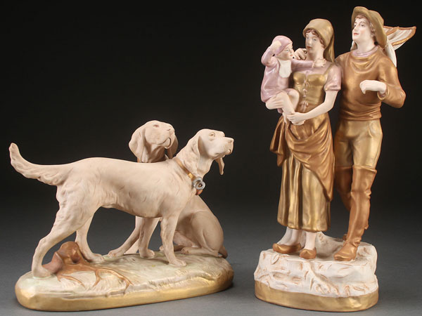 TWO LARGE ROYAL DUX FIGURAL GROUPS, 20TH CENTURY. Modeled as a pair of hunting dogs and a standing couple with young child. Largest 18.75 inches (47.5 cm).