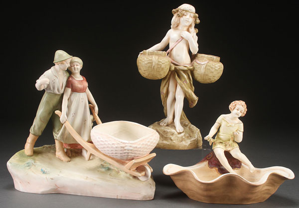 THREE CZECH PORCELAIN FIGURAL PLANTERS, EARLY 20TH CENTURY. Comprising a young couple with wheelbarrow, a young girl with baskets, and young girl with clamshell basin. the largest height 12.5 inches (32 cm).
