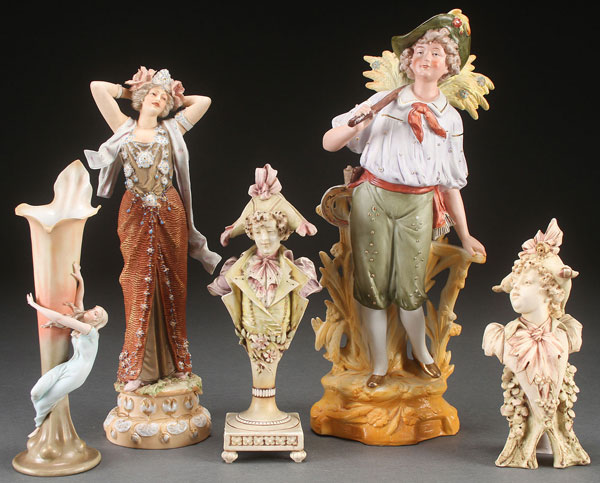 A BOHEMIAN AUSTRIAN AND GERMAN PORCELAIN FIGURE GROUP, LATE 19TH EARLY 20TH CENTURY. Comprising two RSTK figural busts, a Royal Dux standing woman with scarf, a German bisque figure of a farmer, and German lily form vase mounted with a young beauty. The largest 15.25 inches (39 cm).
