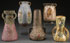 THREE PIECE GROUP OF AUSTRIAN AMPHORA VASES, CIRCA 1900. Comprising a handled vase embossed with birds and stylized florals, a handled vase with stylized iris on a blue ground, a four-handled vase with stylized birds, together with a pair of Julius Strnact with embossed spider web design, the largest with applied cabochon jewels. Height 8.75 inches (22 cm).