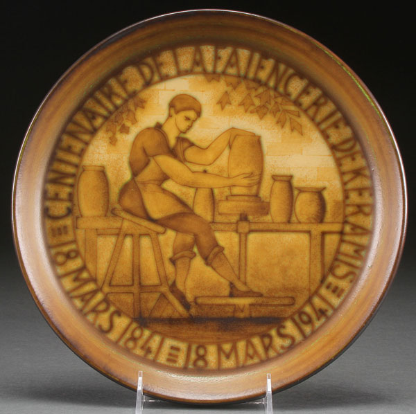A CHARLES CATTEAU FOR BOCH FRERES CENTENNIAL CHARGER, CIRCA 1941. Produced for the 100th anniversary of Boch Freres, decorated in brown monochrome on a pale yellow ground depicting potters and decorators with the inscription "Centenaire De La Faiencerie De Keramis 18 Mars 1841-18 Mars 1941." Inscribed D.2741, Ch. Catteau with Keramis back stamps. Diameter of charger 11.625 inches (29.5 cm).