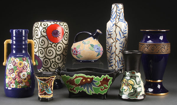 SEVEN PIECE GROUP OF CZECH, AUSTRIAN, AND BOHEMIAN ART POTTERY, EARLY 20TH CENTURY. Of various form and size, all with stylized decoration, including an Amphora enameled planter/jug. The largest height 12.25 inches (31 cm).