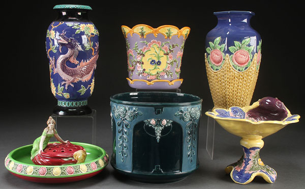 EIGHT PIECE GROUP OF ECHWALD CZECH MAJOLICA ART POTTERY, EARLY 20TH CENTURY. Of various form including a dragon and floral vase, a footed compote, a catch pot with underplate, a figural flower frog, and other items. The largest 12.5 inches (32 cm).