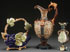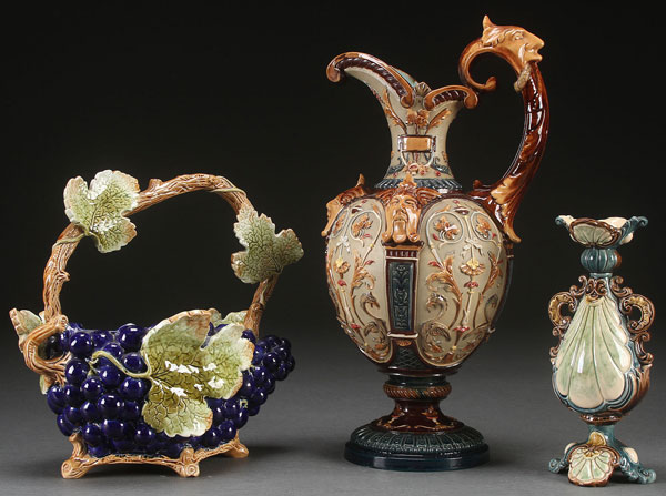 A THREE PIECE GROUP OF WILHELM SCHILLER AND SON AUSTRIAN MAJOLICA ART POTTERY, LATE 19TH CENTURY Comprising a Neo-classic Ewer, embossed with facial masks and embossed foliates below a scrolled handle with grotesque mask terminal, a grape cluster form basket with vine and leaf handle, and a handled scalloped shell form vase, each with "WS & S" embossed marks. The largest 15.5 inches (39 cm).