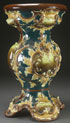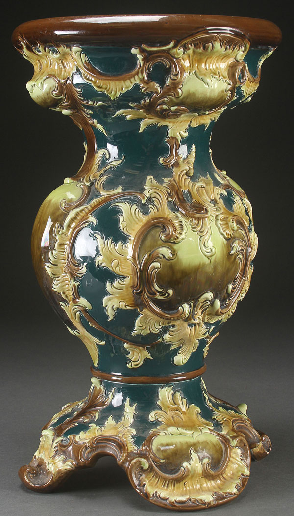 A JULIUS DRESSLER AUSTRIAN MAJOLICA FLOOR PEDESTAL, LATE 19TH CENTURY. A bulbous form with scrolled acanthus shaped cartouches in deep relief embossed first Dressler mark. Height 20 inches (51 cm).