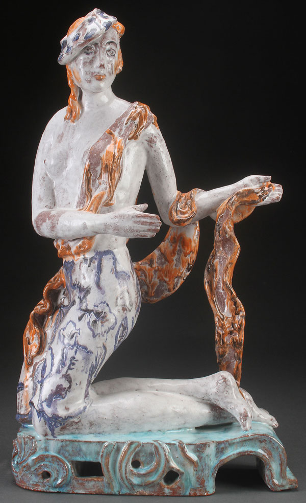 AFTER VALLEY WIESELTHIER (AUSTRIAN 1895-1945) GLAZED CERAMIC FIGURE OF A KNEELING NUDE WITH SCARF. Spurious impressed Wiener Werkstätte mark and artist initials. Height 23.25 inches (59 cm).