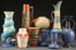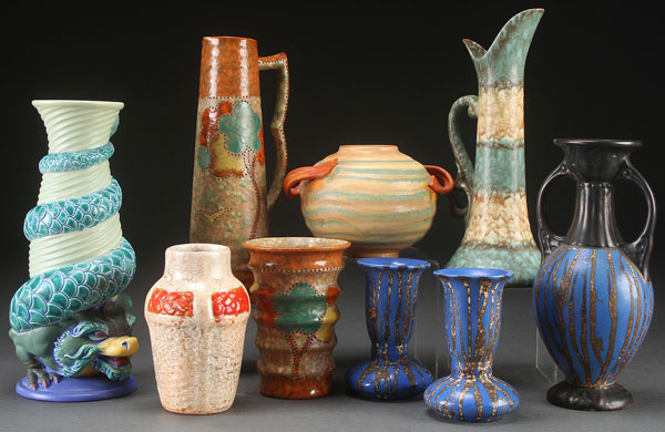 NINE PIECE GROUP OF CZECH ART POTTERY, EARLY 20TH CENTURY. Comprising a stylized floral tankard and matching vase by Ditmar Urbach, three textured vein on blue ground vases, an Art Deco handled vase, a figural dragon vase (chip), and other items. The largest height 11.25 inches (28.5 cm).
