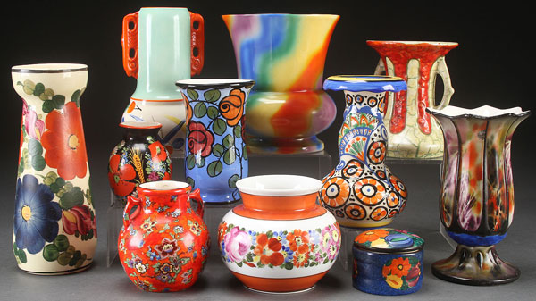 ELEVEN PIECE GROUP CZECH ART DECO POTTERY, CIRCA 1930'S. Of various shape and size with hand painted florals by assorted makers. The largest 9.75 inches (25 cm).