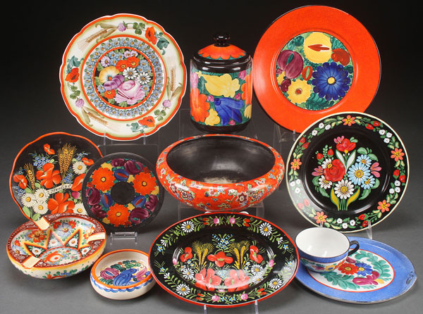 ELEVEN PIECE CZECH HAND-PAINTED ART DECO POTTERY, CIRCA 1920'S. Of various size and form, by assorted makers including Peasant Art Industry and Coronette. The largest 11 inches (28 cm).