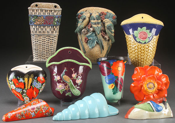 TEN CZECH AND AUSTRIAN ART POTTERY WALL POCKETS, CIRCA 1930'S. Including an Amphora three parrots wall pocket, and an Amphora basket form wall pocket, an Echwald with peacock, several Erphila, a Mrazck, and others. The largest 8.25 inches (21 cm).