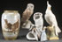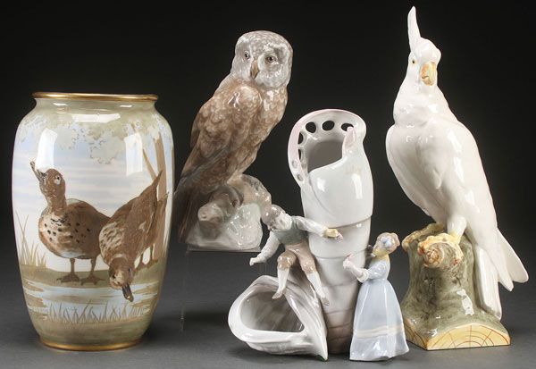 THREE PIECE AMPHORA PORCELAIN GROUP, EARLY 20TH CENTURY. Comprising a large ovoid vase decorated with ducks on a scenic ground, a figure of a perched owl, and a figural vase with young children atop shell forms (repaired), together with a Czech figural vase of a cockatiel. The largest 16.5 inches (42 cm).