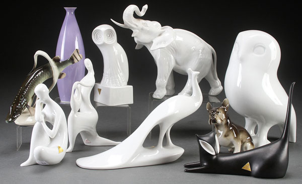 10 ROYAL DUX PORCELAIN FIGURES, LAST HALF 20TH CENTURY. In mostly Blanc de Chien comprising of a stylized owl, elephant, and other animals and female figures together with a musky, a panther, a modern cat, and a lavender vase. Largest 10 inches (25.5 cm).