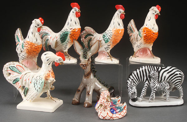 EIGHT ERPHILA BIRD AND ANIMAL FIGURES, EARLY 20TH CENTURY. Comprising five cockrell, a pair of Herend style ducks, a figural zebras group, and a sitting mule. The largest 7.25 inches (18 cm).