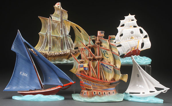 FIVE CZECH ART POTTERY SHIPS, EARLY 20TH CENTURY. Of various shape, three for use as flower frogs, two with Erphila paper labels, and one by Ditmer Urbach. The greatest height 12 inches (30.5 cm).