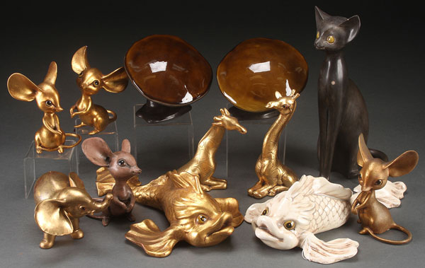 TWELVE PIECE GROUP ANTHONY CALIFORNIA ART POTTERY, MID 20TH CENTURY. Mostly animal forms including a tall cat, gilt finish mice and giraffes, several fish, and other items. The largest height 12.25 inches (31 cm).