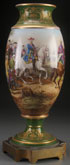A SEVRÉS STYLE HAND PAINTED URN, LATE 19TH CENTURY. With Napoleonic battle scenes by "H. Desprez", raised on a bronze plinth. Height 21.25 inches (54 cm).