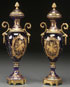 A PAIR OF SEVRÉS STYLE GILT BRONZE MOUNTED PORCELAIN URNS, CIRCA 1900. With gilt enameled decoration over a cobalt blue ground. The bases stamped "Made in France." Height 12.5 inches (31.5 cm).