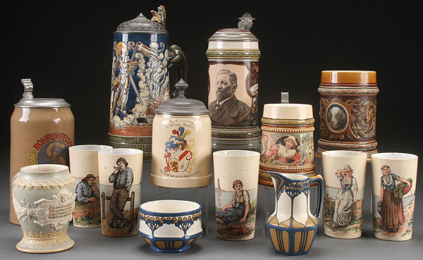 A 14 PIECE GROUP OF METTLACH POTTERY. Comprising steins, pug tumblers and an Art Nouveau creamer sugar. The largest 10.25 inches.