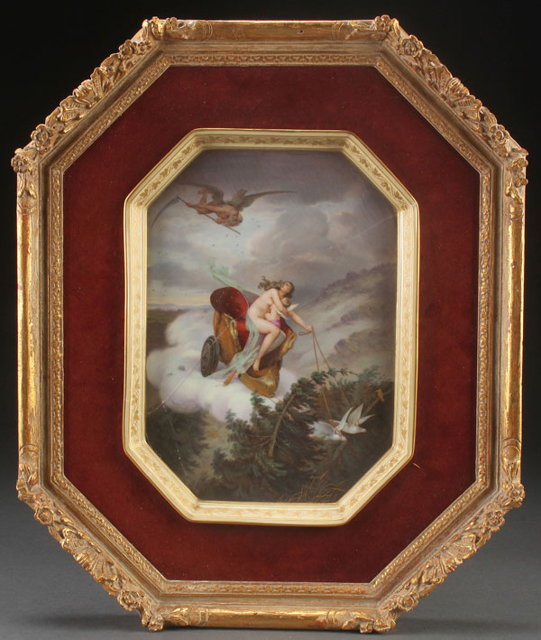 A ROYAL VIENNA HAND PAINTED PORCELAIN PLAQUE, LATE 19TH CENTURY. Depicting a scene with woman and cherub in chariot led by doves fleeing the Angel of Death entitled "Feit Vertreibt Amour". Contained in a carved and gilt frame. Blue underglaze Beehive mark on verso. Repairs. Porcelain 13.25 inches x 9.75 inches (33.5 x 25 cm). Overall 20.5 inches x 17 inches (52 x 43 cm).