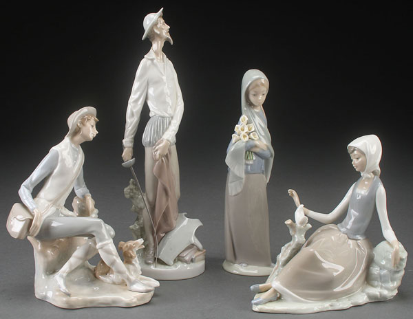 FOUR LLADRO PORCELAIN FIGURES. Including a shepherd, shepherdess with dove, and a Don Quixote. The largest 11.75 inches.