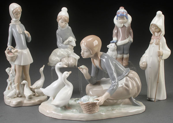 FIVE LLADRO PORCELAIN FIGURES. Including a “Feeding the Ducks” #2346 and others of various figures and animals. The largest 9.5 inches.